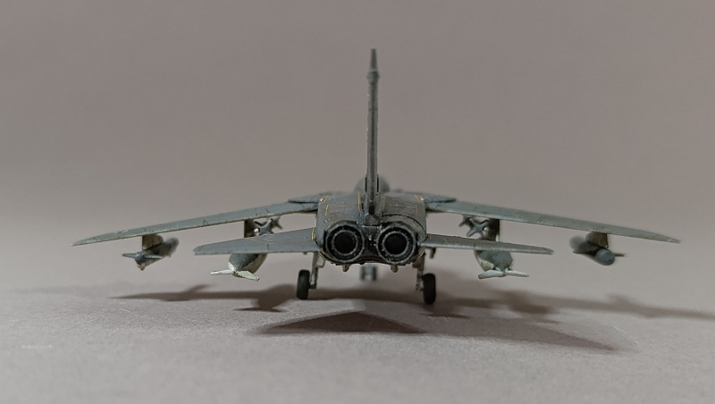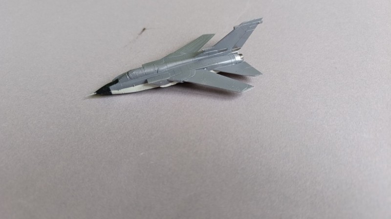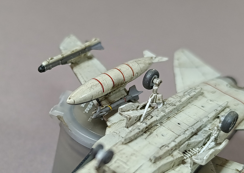 Anschließend ging es an die Lackierung. Zunächst wurde das Modell weiß grundiert, danach lackierte ich die Unterseite mit Light Ghost Grey von Ammo of Mig, die Oberseite mit Dark Grey, ebenfalls von diesem Hersteller. Auch das Triebwerk sowie die Nase wurden direkt mit der Airbrush lackiert. Ebenso erhielten die Kleinteile wie Bewaffnung, Zusatztanks, Pylone und Fahrwerk ihre Farbgebung auf diesem Weg.