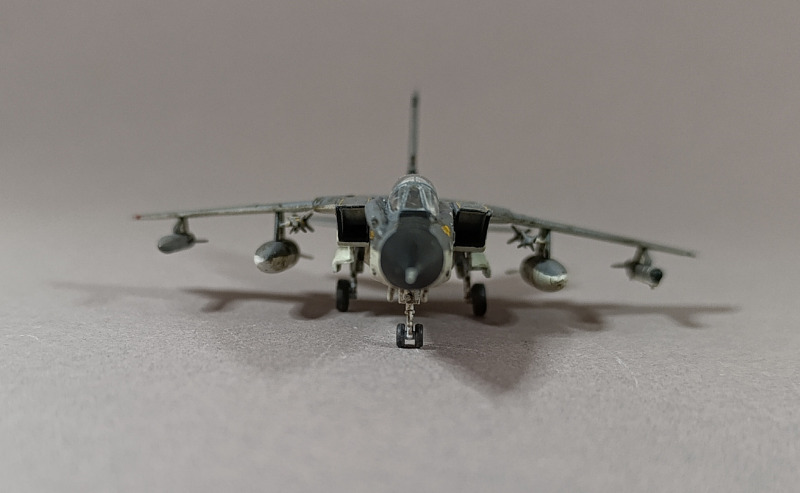 Die letzten Kleinteile wurden anschließend noch angebracht. Hier zeigen sich allerdings auch die Grenzen des Maßstabs, denn gerade das Fahrwerk und insbesondere die Fahrwerksklappen wirken maßstäblich etwas zu dick, und auch der Fahrwerksschacht ist recht einfach gehalten. Mit einer ansprechenden Bemalung lässt sich das jedoch durchaus kaschieren. Am Bugfahrwerk ergänzte ich zusätzlich noch Landescheinwerfer.