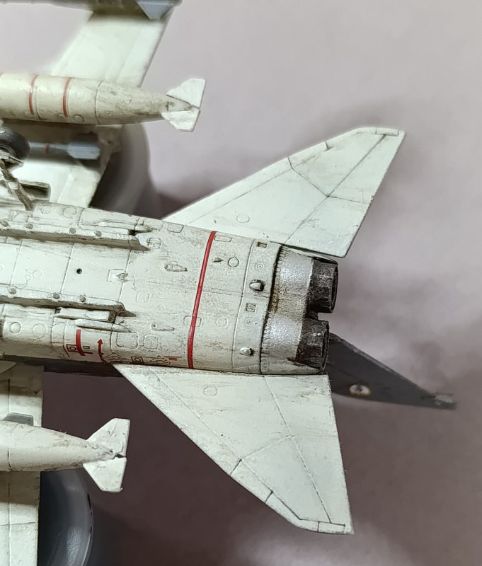 Das Seitenleitwerk lag separat bei, ebenso die Lufteinläufe. Bei Letzteren stellte ich mich allerdings etwas ungeschickt an: Mir war der kleine Höhenunterschied zum Rumpf nicht bewusst, weshalb ich bereits damit begann, großzügig zu spachteln und zu schleifen. Zum Glück warf ich noch rechtzeitig einen Blick auf das Vorbild und konnte mich im letzten Moment bremsen.