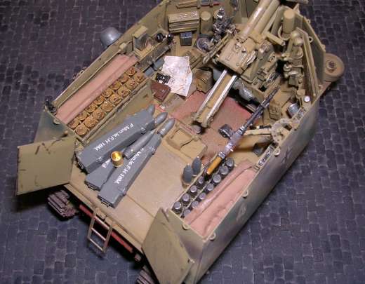 Es handelt sich um das Trumpeter Modell in 1:35 des LeFh 18 (Sf) aufGeschützwagen 38H(F). Das Modell wurde mit dem Update Set von Blast Models, sowie den Einzelgliederketten von FriulModel gebaut. Außerdem wurden noch diverse Teile aus meinem Kleinteilefundus verwendet. Das Modell soll ein Fahrzeug der Sturmgeschütz-Abteilung 200 der 21.Panzer-Division zur Zeit der Invasion in der Normandie 1944 darstellen.