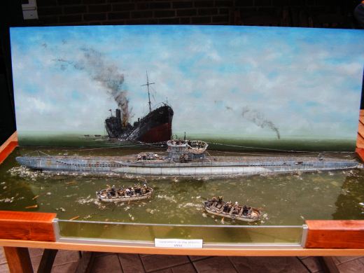 Der von mir gefertigte Hintergrund wurde aufgrund von Originalfotos nachempfunden. Dem sinkenden Handelsschiff hat ein Torpedo das "Rückgrat gebrochen", wobei es in der Mitte zerbricht.