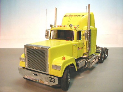 Italeri Mack Superliner mit größerer Sleeperbox und in einer giftgrünen Lackierung, die jede Mamba erstarren läßt (Entschuldigung Mamba)! Der Italeri Kit Nr 798 wird als „US Power Truck“ angeboten, anscheinend gab es Lizenzstreitigkeiten zwischen Modellwerkstatt und Hersteller. Das im Bausatz befindliche Modell stellt jedenfalls einen Mack Superliner dar und besteht aus 275 Bauteilen, die in 17 Baustufen unterteilt sind. Das fertige Modell hat eine Länge von 34 cm und ist im Maßstab 1:24 immerhin fast 16 cm hoch. Wegen den bereits vermuteten Unstimmigkeiten liegen dem Kit keine Firmenlogos bei; glücklicherweise fanden sich jedoch in der Grabbelkiste Abzeichen und Logos alter Ertl-Bausätze, sodaß der Superliner trotzdem seinen „Mack“-Schriftzug hat.