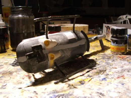 Insgesamt musste das Modell um 0,78 Millimeter verlängert werden. Hierzu wurden die Rumpfteile auseinander geschnitten und die Rumpfteile eingepasst und mit Sekundenkleber fixiert. Anschließend fertigte ich anhand der technischen Unterlagen von Eurocopter Schablonen an, um die dritten Seitenfenster auszuschneiden. Danach musste nur noch die Bodenplatte im Innenraum verlängert werden. Die medizinische Innenausstattung fertigte ich mit Hilfe von Teilen des EC-145 Bausatzes an. Sitzgurte und andere Teile wurden dann ebenso gescratcht. Für das Lautsprechersystem an der Unterseite wurden die dem ADAC Bausatz beiliegenden Teile angeschliffen und mit Spachtelmasse verkleidet und anhand von Fotos in Form geschliffen. Auch wurde das Fixtausystem und andere Teile am Rumpf des Modells gescratcht. Für den Hauptrotor nahm ich einfach den Rotor einer BK-117, bei dem ich die Rotorblätter um 1,8 Zentimeter kürzte und die Enden in Form schliff.