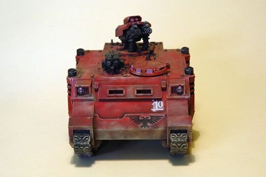 Bemalt habe ich das Fahrzeug in einer Abwandlung von "Blood Angels Red", anschließend hat das Modell die üblichen Effekte erhalten. Mittlerweile bin ich auf Spritzpistole umgestiegen, so dass mich jetzt die grobe Oberfläche der Pinselbemalung im nachhinein doch ein wenig befremdet ;-) Bei den Washings für Filter und Verschmutzung habe ich diesmal nur verdünnte Acrylfarben verwendet - dabei bin ich mit der Verdünnung erstmals höher gegangen und habe gleichzeitig die Anzahl der Washings an sich erhöht.