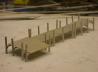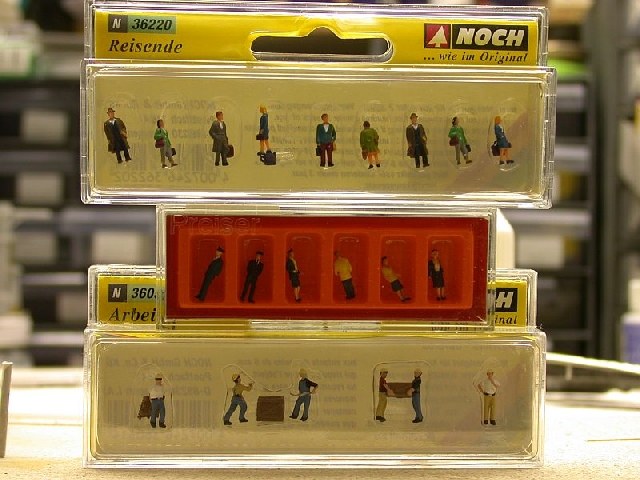 Der Aufbau geht weiterDer Landungssteg wurde zuerst grob vorskizziert, dann eine Vorzeichnung gemacht, und schließlich aus diversen Polystyrolprofilen zusammengeklebt. Die Laufflächen sind „N scale car siding“ von Evergreen, ein auch bei Urmodellbauern zur Darstellung von Schiffsdecks beliebtes Material. Bemalt wurde der Steg mit verschiedenen Acrylfarben in grünlich-grauen Tönen. Ein Wash und ein Auftrag von mehr Grüntönen um die Wasserlinie schlossen die Bemalung ab. Der Steg wurde mit Weißleim in die vorgebohrten Löcher eingeklebt. Der Güterschuppen ist ein Modellbahnbausatz in Spur N, der schon in den passenden Farben gespritzt war. Hier wurde nur mit Ölfarben trockengemalt, um die Farben etwas abzutönen und realistischer zu gestalten. Eine Alterung erfolgte mit Pastellkreiden. Der Blick auf das nicht vorhandene Innenleben wird durch eine wie zufällig abgestellte Kiste versperrt ;-) Es kommt Leben in die BudeEs war erheblich schwieriger als gedacht, passende Fahrzeuge zu erhalten. Schließlich blieben nur zwei einigermaßen altmodische Autos von BUSCH übrig, die ich im örtlichen Modellbauladen bestellte. Während ich auf die Lieferung wartete, beschaffte ich mir mehrere Figurensets: Ein Satz Bauarbeiter sollte sich als Statisten im Hintergrund halten; ein Satz Reisender sollte die Clipperpassagiere geben, und Zugpersonal für den EUROSTAR würde meine PAA – Crew werden. Das erforderte ein paar Korrekturen: Einige der Figuren hatten Auswerfermarken, die entfernt werden mußten; einige mußten teilweise umbemalt werden, um stimmiger zu wirken; und alle erhielten einen schwarzen Ölfarben – wash, um die Details zu betonen und die zu bunten Farben etwas abzutönen. Schließlich wurden alle Figuren noch mit Mattlack gespritzt. Um etwas mehr Leben ins Bild auf dem Steg zu bekommen, baute ich mir noch ein paar Koffer aus Polystyrolprofilen und Handgriffen aus Stücken fotogeätzter Reling. Nachdem die Fahrzeuge schließlich eingetroffen waren, wurden sie umgehend in Arbeit genommen. Die Limousine sollte gerade betuchte Passagiere abgeliefert haben; sie erhielt nur einen schwarzen Wash am Kühlergrill, um die Details zu betonen. Der Pickup sollte den Bauarbeitern dienen und wurde mit Washes, trockenmalen und Pastellkreide gealtert und allgemein verwarzt.