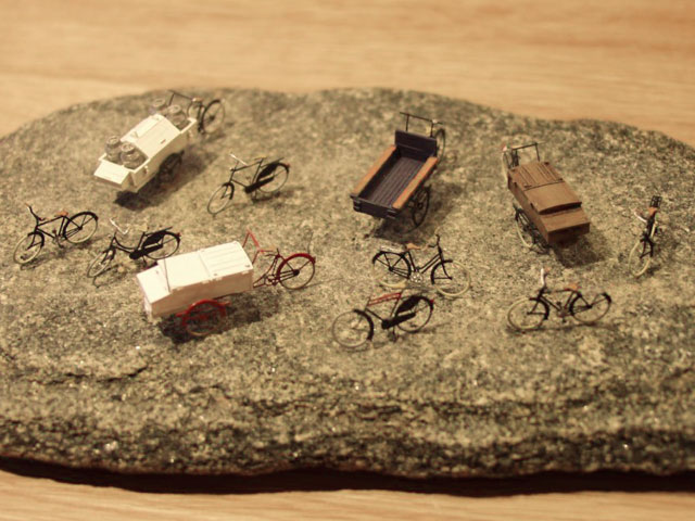 Heute möchte ich ein kleines Urlaubs- oder Wochenendprojekt vorstellen. Bei den Modellen handelt es sich um Bausätze der Firma Artitec. Es sind verschiedene alte Fahrräder, Lastenräder und Motorräder, zwei Harleys, eine Triumph, eine BMW R 75 mit Beiwagen, eine BMW R 25. Die Bausätze bestehen aus einigen Resinteilen und einer kleinen Ätzteilplatine.