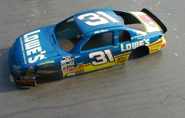 Hier der 1997 Chevrolet Monte Carlo #31 Lowes, gefahren von Mike Skinner, Hauptsponsor ist ein Warenhaus. Die blaue Kunststoffkarosserie von Monogram wurde zunächst mit grauer Autogrundierung grundiert, die gelben Flächen als hellere Farbe zuerst lackiert, dann das Blau per Sprühdose. Die gelben Flächen auf den Seiten trotzdem noch mal mit den gelben Decalstreifen belegt. Die weißen Decals für Motorhaube und Dach waren nicht deckend und wurden jeweils mit einem zweiten Decal überklebt. Weitere Bilder