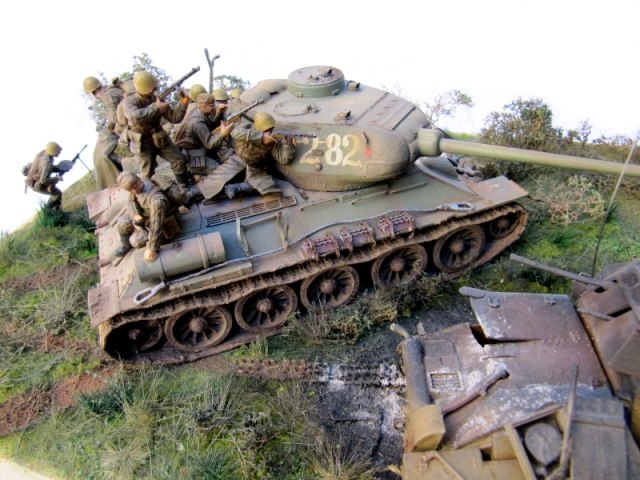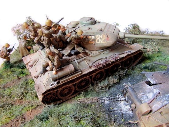 Offensive der roten Armee im Spätsommer 1944. Dargestellt wird ein typischer Angriff mit aufgesessener Infanterie. Die Soldaten sitzen hektisch ab und ein Offizier weist sie in ihre Angriffspositionen. Ein abgeschossener und ausgebrannter Aufklärungspanzer 38(t) zeugt von den heftigen Kämpfen der letzten Tage.