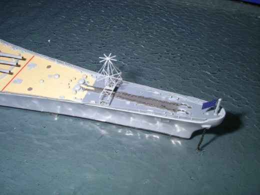 Nach mehreren Lackierungsvorgängen mit Future waren dann auch die Trägerfilme der Abziehbilder unsichtbar geworden und das Schiff bekam ein Finish aus Semiglosslack. Zu guter Letzt wurden noch die Antenneverspannungen und die Seile der Signalflaggen gesetzt. Diese wurden mit transparentem Faden aus Polyadmid erstellt. Die Signalflaggen habe ich im Internet entdeckt. Verkleinert auf den Maßstab 1/700 wurden sie anschließend 2x2mm groß mit einem Farblaserdrucker ausgedruckt, gefaltet und an die Flaggenseile geklebt.