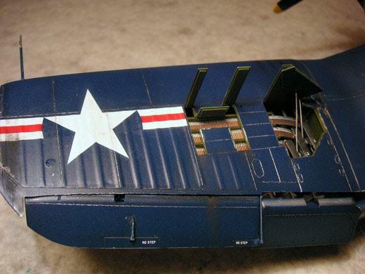 ProblembereicheJa, wer hat die nicht... Beim vorliegenden Bausatz liegt das wirklich ärgerlichste Problem bei den vielen (leider) Trumpeter-üblichen Auswurfmarkierungen (Ejector-Pins) an den Spritzlingen selber. Hier verbrachte ich Stunden damit, diese herauszuschleifen, beziehungsweise sie mit Sekundenleim aufzufüllen und dann wieder glattzuschleifen. Leider ist der Luftansaugbereich für den Turbolader an der Motorenschnauze nicht geöffnet dargestellt. Schade ist auch, dass die Fußrasten, welche den Zugang zum Cockpit ermöglichten, nur als gelbe Decals geliefert werden. Die Gravuren lassen teilweise auch zu wünschen übrig; ich musste relativ viel von Hand nachgravieren. Ein weiteres Detail, welches ich trotz intensivsten Nachforschungen nicht beantworten konnte, ist die Finne des Modells. Betrachtet man das Modell von vorne, so steht die Finne etwa zwei Millimeter schräg nach links auf dem Rumpf! Nicht nur, dass dies von der Aviatik (Danke, Karl!) her problematisch sein könnte, es fällt halt sehr ins Auge. Weiss da irgendjemand mehr darüber? Bitte entsprechende Info an szhsbo@gmx.net senden! Vielen Dank im Voraus! Nachtrag: Einen Tag später erhielt ich per Mail eine Antwort von Wolfgang Zeissner: "... das Seitenleitwerk der F4U war zum Ausgleich des Drehmomentes vom Motor schräg angebaut und versetzt. Viele anderen Kolbenmotorjäger haben eine ähnliche Bauweise." Herzlichen Dank für diese Information, Wolfgang! LackierungZu 90% verwendete ich Tamiya Farben, die ich zum Teil selber abmischte. Die Metalltöne geben meiner Meinung nach am realistischsten die Alclad-Metalizer Farben wieder. Das ganze Modell wurde mit der Airbrush lackiert. Die Farb-Abplatzer entstanden durch ein vorsichtiges Abschaben der Farbe. Zuvor wurde das ganze Flugzeug mit Alclad "Aluminiumisiert". Mittels Pastellkreide und der "Nass-in-Nass" Technik entstanden die Verschmutzungen.