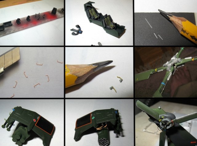 Auf diesem Kombi-Bild sind diverse Detaillierungsarbeiten zu sehen: Haltegriffe und Schließhebel am Cockpit, Verkabelung an den Waffen und am Heckrotor, die markant auf jedem Originalfoto erkennbaren kleinen Folienstreifchen für die Schiebefenster am Cockpit, und eine minimale Detaillierung am Hauptrotor. Zudem erkennt man meine Vorgehensweise für das Spritzen kleiner Teile: Ich klebe sie mit Sekundenkleber auf einen alten Maßstab aus Kunststoff, das ist sehr handlich bei dem Drehen und Wenden beim Spritzen! Auch die Scheibenwischer wurden selbst erstellt.