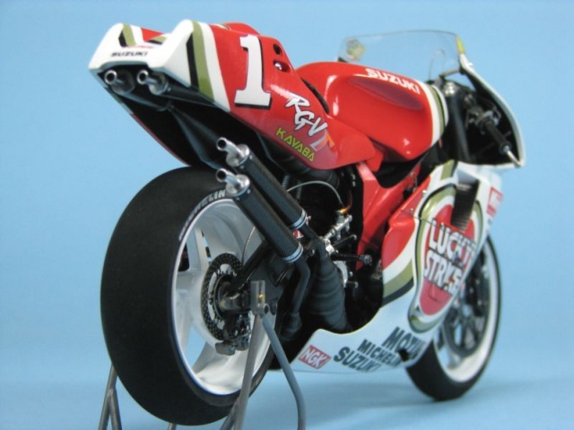 Es ist vollbracht! Ich hab die Rennsusi von Kevin Schwantz, dem Meister des Spätbremsens, fertig gestellt! Zum Transkit von Studio27 benötigt man noch zusätzlich eine RGV 500 (XR-79) von Tamiya als Teilespender. Der Bau des Studio27-Kits war nicht immer einfach, aber für meinen ersten Resinkit ist das Ergebnis ganz akzeptabel geworden, glaube ich zumindest. Gelernt habe ich beim Bau auch eine Menge! Nächstes Mal werde ich das Modell erst komplett trocken fertig bauen, und erst dann lackieren! So mussten jetzt etliche Lackabplatzer und Schrammen ausgebessert werden, die beim Anpassen verschiedener Teile entstanden.