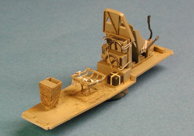 Umbau-Maßnahmen Die fehlenden Nieten und Senkschrauben wurden mit diversen Kornstichelgrößen hergestellt. Der frühe Feuerlöscher (Bausatz Weißmetall) wurde in der späteren zweiten Version von mir aus Plastik selbst hergestellt. Genauso verfuhr ich mit dem 5 to Spindelbock. Die fehlenden Zurrösen, diverse Haken, Scharniere, etc. p.p. wurden auch aus Plastik nachgebaut und montiert. Das Carden Loyd Laufwerk musste gleichfalls nachdetailliert werden. Die Ketten sind als ganze Segmente aus Weißmetall hergestellt und sollten stumpf zusammen geklebt werden. Ich habe in derselben Methode, wie man Friul Ketten zusammen baut, entsprechende Löcher mit einem 0,3 mm Bohrer gebohrt und die Segmente mit Hilfe von Kupferdraht zusammen gefügt.