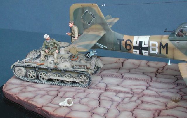 Bausatz Als Zugmaschine für meine Afrika Stuka wurd dieses 8 x 4 cm große Modell der Firma WSW aus Villingen-Schwenningen in den DAK Farben gebaut. Die Bauteile sind überschaubar und in einer befriedigenden bis ausreichenden Qualität hergestellt. Das Modell stellt eine Ausführung A der 3. Bauserie dar. Erkennbar an den noch geschwungenen Laufwerkshebeln. Der PI wurde in der Ausführung A mit der zusätzlichen Bezeichnung Tp für Tropenversion noch in Afrika eingesetzt. Insgesamt 25 Panzer I (ohne Pz. Bef. Kfz.) wurden mit dem Panzerregiment 5 nach Afrika verlegt, davon waren nach dem 700 km Verlegungsmarsch in den Raum El Agheila zwölf Fahrzeuge ausgefallen, bzw. reparaturbedürftig. Man geht davon aus, dass der P 1 bis zum Herbst 1941 gemäß seiner Definition als solcher nur noch in den hinteren Linien eingesetzt wurde. Es soll in Afrika sogar eine Instandsetzungseinheit mit diesem Fahrzeug gegeben haben.
