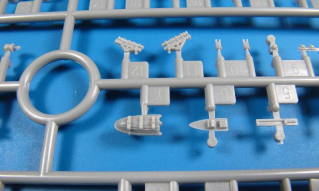 Auch der nächste Spritzling (B) liegt auch den anderen Bausätzen der Klasse bei und ist dazu zwei Mal enthalten. Hier finden sich u.a. Teile für den Modellständer, Beiboote, Satellitenantennen, Rettungsinseln, 1,27 cm-MG, 2,5 cm-Bushmaster, Nulka- und Mk 36 SRBOC-Störkörperwerfer. Die MG sollte man durch Ätzteile (z.B. von FlyHawk) ersetzen, da die Plastikteile doch sehr globig wirken, eventuell findet man auch besere Bushmaster-Geschütze. Bei den SPG-62 (Mk 99)-Feuerleitradar könnte man an der Schüssel (Teil B25) die vorgebauten Teile ergänzen. Einige Teile werden nicht gebraucht, z.B. die Harpoon-Starter und die Phalanx-Geschütze. Eines der letzteren könnte man aber für den aktuellen Zustand des Schiffes verwenden, für den man sich auch zwei weitere Teile B24 (Satellitenantenne) wünschen würde.