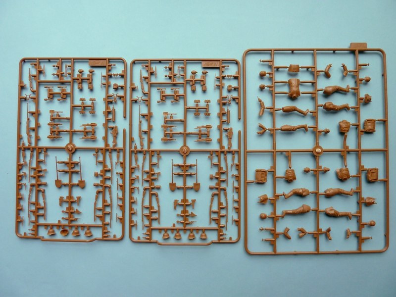 Die drei Spritzlinge des Bausatzes. Die Schachtel beinhaltet das aus demselben Hause stammende Set WWI German Infrantry Weapon, das in Form von zwei Spritzlingen als "Ausrüstungsgrundlage" für die Männer aus Plastik beiliegt. Als Bewaffnung stehen zur Auswahl: Tankgewehr M1918, Mauser Karabiner 98, Bergmann MP18, Pistolen Mauser C96 und Luger 08, Kugelhandgranaten, und, na klar, das wassergekühlte 08/15-MG fehlt auch nicht! Dazu gibt es zahlreiche Ausrüstungsgegenstände, wie Magazine, Magazin- und Gasmaskentaschen, Klappspaten, Helme Typ 1916, Bajonette und Scheiden, Drahtschneider, große und kleine Schaufeln, Äxte, Pickel, Fernglas, Essgeschirr. Kurzum vieles, was das Soldatenherz im Felde erfreut.