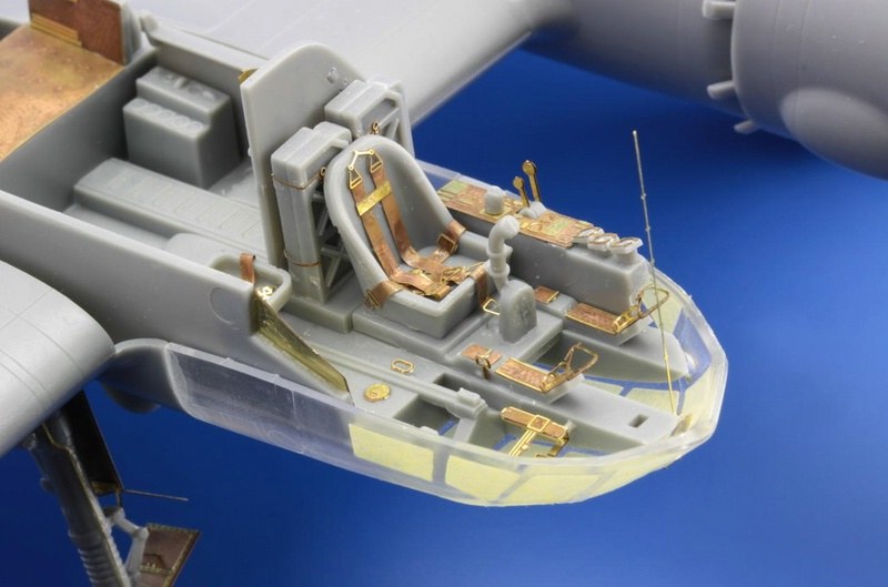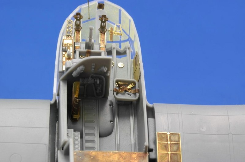 Das Set im Überblick. Das Ätzteilset kommt wie gewohnt bei Eduards "größeren" Sets mit zwei Platinen unterschiedlicher Machart daher. Ein Ätzteilbogen aus naturfarbenem Messing und ein silberfarben platinierter, der lackierte Ätzteile enthält. Der HB-Bausatz enthält keine Sitzgurte. Umso besser, dass man sie mit dem vorliegenden Set ergänzen kann. Aber auch die anderen Ätzteile sind durchaus brauchbar für den Bausatz. Wer leere Magazinbehälter im Cockpit darstellen möchte, kann dies mit Hilfe der Ätzteile tun (die des Bausatzes sind "voll aufmunitioniert"). Da man beim HB-Bausatz guten Einblick in den vorderen Bereich des Cockpits hat, sind die von Eduard gelieferte, filigrane Seitenruder-Pedalkonstruktion und die Beobachtungs-/ Bombenzielvorrichtung sehr willkommen, weil sie schön anzuschauen sind und daher eine Verbesserung des Bausatzes bedeuten. Aber auch Fahrgestell und Außenbereiche des Kits werden an markanten Stellen mit Radabdeckungen, Panels, Bombenschlössern etc. sinnvoll bedacht.