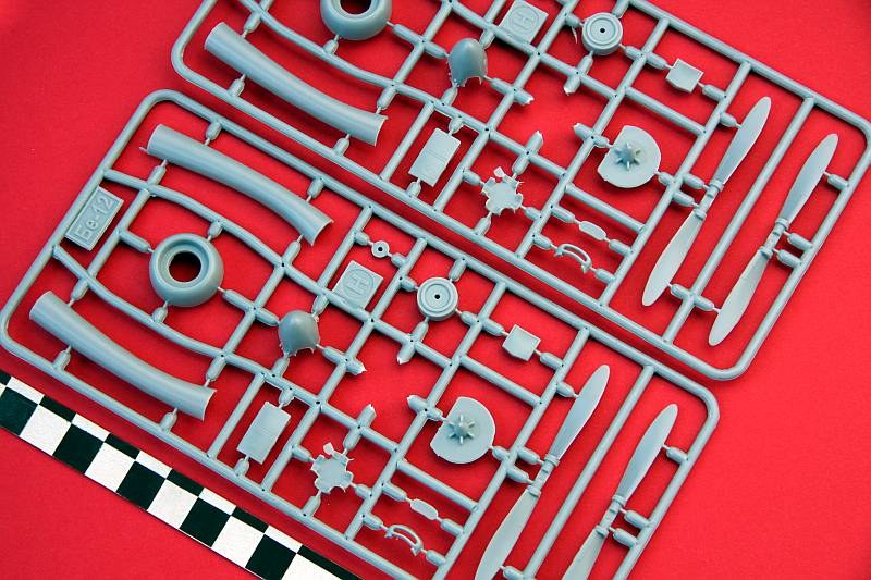 248 Teile an 18 Spritzrahmen, die Rumpfhälften schon vom Spritzstrang befreit. Der Rumpf noch einmal in der Länge geteilt, was auf eine limitierte Baugröße der Spritzautomaten schließen lässt. Auffällig die sehr glatten Oberflächen, die sauberen und exakten Gravuren, aber auch, bei dieser Ganzmetallkonstruktion, das völlige Fehlen von Nietreihen. Alle Teile sind qualitativ sauber gespritzt, besitzen aber keine Pass- oder Montagestifte. Das ist nicht sehr einsteigerfreundlich, aber ich denke mit so einem Modell wird kaum jemand mit dem Plastikmodellbau beginnen. Der Zusammenbau beginnt mit dem Cockpit, das schon sehr komplett ist und durch die klaren Kanzelteile gut einsehbar ist. Die Triebwerke werden auf die Tragflächen geklebt und haben innen liegende Schubrohre mit der richtigen Länge. Die Hauptfahrwerksschächte sind wunderbar detailliert und werden aus acht Teilen zusammen gesetzt. Trotzdem kann man die eine oder andere Leitung noch zusätzlich einbauen. Im übrigen ist die Be-12 im Internet sehr gut dokumentiert. Man kann sich hier viele Dinge ansehen und das eine oder andere Detail noch verbessern. Die ganze Fahrwerksmechanik, ein einziger Blickfang. Ein Problem sehe ich bei den beigelegten Gummireifen für die Räder. Diese haben ein schönes und passendes Reifenprofil, sind aber sehr weich. Die Erfahrung hat gezeigt, dass bei solchen Gummiteilen mit zu viel Weichmachern sich die Reifen zersetzen und selbst die Felgen auflösen. Da wird mit Sicherheit ein geeigneter Hersteller einen Austauschsatz nachschieben. Man muss die Dinge zeitnah beobachten.