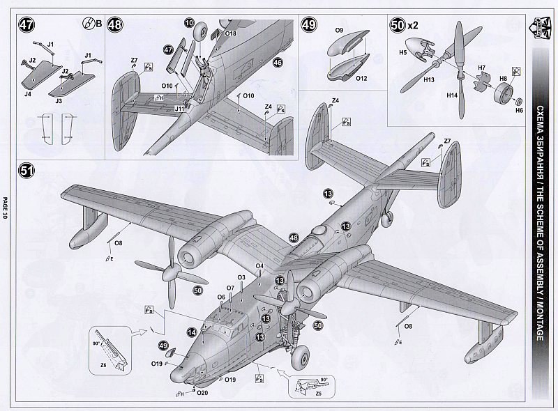 Während der Rumpf innen leer ist, befindet sich hinter der Tragfläche noch ein Beobachtungsblister mit einem darunterliegenden Bordsegment. Die Propeller werden aus sechs Teilen montiert und brauchen erst bei der Endmontage an den Triebwerken angeklebt werden. So kann beim ständigen Handling nichts abbrechen. Der beiliegende, sauber gedruckte Decalbogen lässt einen dünnen Trägerfilm erahnen. Es sind zwei Varianten möglich, eine russische Be-12 (rote 30) und eine Maschine der ukrainischen Navy (gelbe 02). Zur weiteren Bausatzausstattung gehört noch ein Maskierbogen für die Cockpitscheiben sowie eine kleine Ätzteilplatine. Das Besondere hierbei sind zwei kleine Scheibenwischer. Die 12-seitige Bauanleitung, auf Glanzpapier gedruckt, geheftet, absolut vorbildlich. Mit 51 Zeichnungen wird der Zusammenbau gut dargestellt. Dazwischen eingefügt, erläuternde Zeichnungen, für das technische Verständnis zu speziellen Details. Groß und übersichtlich, die Farbzeichnungen für die Bemalung der jeweiligen Amphibien. Bei den Farben dürfte es keine Probleme geben, orientiert man sich hier doch an Humbrol.