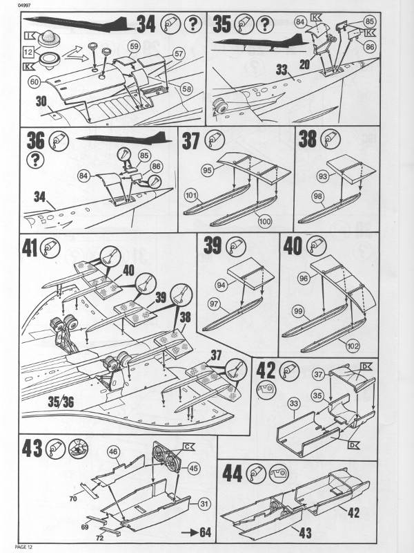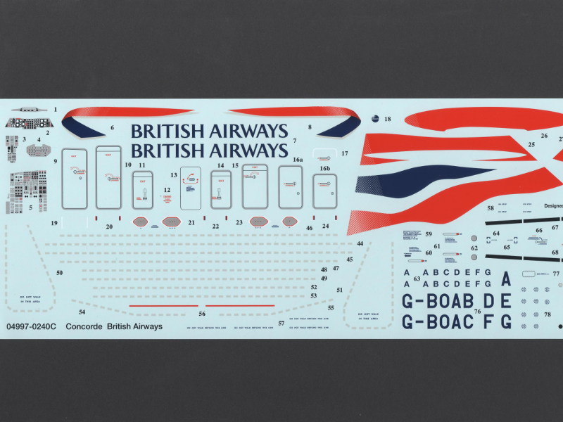 Der Bausatz:Hier hat Revell den Bausatz von Heller unverändert übernommen. Airfix hatte dies bereits 2004, 2005 und 2008 praktiziert. Deswegen gibt es zum Bausatz nichts Neues zu berichten. Die Gravuren sind zwar versenkt, wirken aber im Vergleich zu anderen Bausatzneuheiten aus dem Erscheinungsjahr 2004 etwas grob. Die meisten Bauteile sind aus weißem Kunststoff. Die Teile für die Triebwerke sind in Schwarz und Teile für das Fahrwerk in Silber. Das soll das spätere Lackieren erleichtern. Außerdem liegen Metallstifte bei, die in die Fahrwerksstreben verbaut werden sollen. Das sorgt für einen bruchsicheren und stabilen Stand, wenn man das Modell später auf seine Beine stellen möchte. Optional liegt ein großer Displayständer bei, auf den das Modell gesteckt werden kann. Klarteile liegen nur für das Cockpit vor. Die Öffnungen für die seitlichen Rumpffenster sind zwar vorhanden aber eben keine Klarteile. Hier muss der Modellbauer für sich selbst entscheiden, wie er sein Modell darstellen möchte. Die Reifen des Fahrwerks bestehen aus einem weichen Kunststoff. Das ist suboptimal, da die Reifen bei längerer Belastung platt werden können und nicht die Form halten. Bei Benutzung des Displayständers spielt das dann aber keine Rolle. Die markante Bugnase kann beweglich montiert werden. Die Bauanleitung ist neu entworfen. Erstmals erlebe ich es bei einer Revell-Anleitung, dass Hinweise gegeben werden, an welchen Stellen des Modells gespachtelt und geschliffen werden soll. Ungewöhnlich für Revell - aber der Modellbauer wird es danken! Es fehlt eine Gewichtsangabe für die Bugspitze. Weil das Bugfahrwerk relativ weit vorne angebracht ist wird die Maschine sich vermutlich nicht auf den Hintern setzen. Aber um jedes Risiko auszuschalten sollte man ein Gegengewicht unterbringen. Bei einer Präsentation auf dem Ständer kann das Gewicht entfallen. Lagen der Erstauflage des französischen Bausatzes nur Decals von französischen Maschinen bei, so hat Revell jetzt einen neuen Markierungsbogen für sieben englische Maschinen hergestellt. Qualitativ machen die Decals von Revell einen deutlich besseren Eindruck als die von Heller. Als Beilage zum französischen Bausatz gab es noch ein 36-seitiges A4-Heft mit Detailfotos der Concorde sowie einen ausführlichen Lebenslauf zu jeder französischen Maschine. Auch gab die Bauanleitung von Heller Hinweise darauf, wo am Modell Löcher zu bohren sind, damit es mit Fäden aufgehängt werden kann. Beide Zugaben fehlen zwar bei der Version von Revell. Dafür ist der Bausatz auch deutlich günstiger im Preis als das französische Original. Die Bauanleitung und der Markierungsbogen: