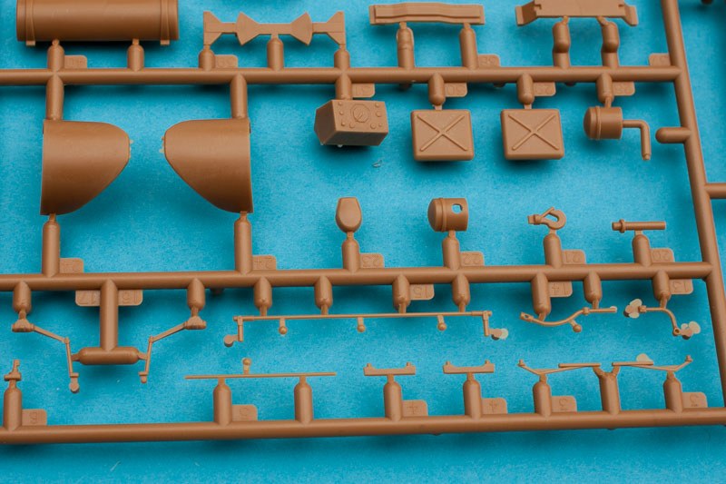 Der Bausatz ist eine Formenvariante des hier bereits vorgestellten Pritschen LKW. Bis auf einen Rahmen und die Decals sind beide Bausätze identisch. Ausgetauscht wurde der Rahmen D, der zuvor einige weitere Teile für die Pritsche enthielt. Nun finden sich dort die Teile für den Kofferaufbau, eigentlich sind es nur eine Hand voll Teile. Warum man die wenigen Teile, die man für beide Varianten benötigt hätte, nicht einfach drin gelassen hat, ist nicht nachvollziehbar. Nun denn, an der hervorragenden Detaillierung des Bausatzes ändert das freilich nichts. Es gibt einen vollständig nachgebildeten, aus gut 20 Teilen bestehenden Motor und den kompletten Antriebsstrang sowie einen ebenfalls sehr schön gemachten, allerdings recht kompliziert aufgebauten Rahmen. Das komplette Chassis ist eine eigene Baugruppe, auf die dann die Aufbauten aufgesetzt werden. Bis dahin hat man 36 Baustufen hinter sich gebracht und etwa 80 Einzelteile (inklusive der Räder) verbaut. À propos Räder, hier hat ICM so wie es aussieht einen kleinen Fehler gemacht. Die Bausatzräder haben einen Durchmesser von 24,5mm, rechnet man die Originalbereifung um müssten sie gut 1,5-2mm mehr haben. Klingt wenig, fällt aber auf.
