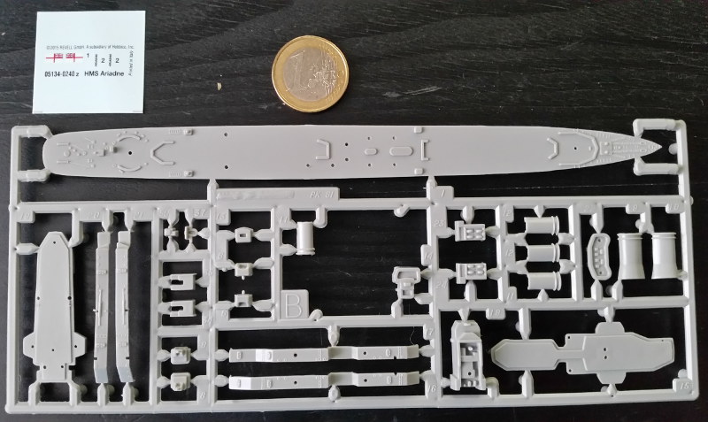 Der Bausatz:Es handelt sich bei diesem Bausatz um einen alten Matchbox Bausatz im Maßstab 1:700. Der war in Hellgrau und Dunkelgrau gehalten, Revell hat für den Bausatz einen hellgrauen Kunststoff verwendet. Das Modell ist in Wasserlinie dargestellt. Matchbox brachte 1977 die HMS Ariadne heraus. Es sind zwei Gussäste vorhanden, die sehr sauber und ohne große Gratbildung hergestellt sind. Einige Kleinteile sind sehr dicht zusammengedrängt, was das Heraustrennen erschwert. Auch sind die Geschützrohre für ungeübte Hände in Gefahr, beim Abtrennen zu Bruch zu gehen. Wer ein bisschen mehr aus dem Modell machen möchte, sollte die Restekiste und diverse Ätzteile benutzen. Im Großen und Ganzen macht der Bausatz einen sehr ordentlichen Eindruck. Es gibt allerdings nur Decals für die HMS Ariadne, nicht für ihre Schwesterschiffe. Wie auch früher bei Matchbox üblich, so ist aktuell ein Satz mit Flaggen dabei. Die Bauanleitung ist übersichtlich und beinhaltet auch ein Tarnschema von 1943.