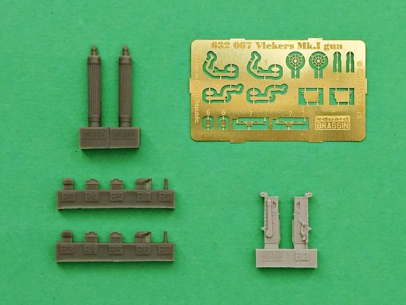 Ein weiteres Set der Brassin Serie liefert Eduard Ende 2015 mit dem Vickers MK.I MG für die Detaillierung von WW1 Flugzeugmodellen. Das Set besteht aus 14 Resinteilen, 14 Ätzteilen und der Bauanleitung und wird in der serientypischen Verpackung gut geschützt. Für den Zusammenbau wird zusätzlich pro MG ein Stück 0,3 mm x 1,5 mm Draht benötigt. Der Guss der Resinteile ist sauber und frei von Luftblasen. Der Detaillierungsgrad ist hoch und vermutlich für den Maßstab der aktuell Best erhältliche. Lediglich das Aufbohren der Rohre könnte aufgrund der Form der Mündungöffnung problematisch werden. Dafür ist Fingerspitzengefühl und eine Satz Micro-Bohrer Voraussetzung. Die Ätzteile sind mehrstufig geätzt und sitzen an kleinsten Stegen, so dass diese schnell aus dem Träger entfernt werden können ohne stark zu verbiegen. Die beiliegende farbige Bauanleitung lässt keine Fragen offen. Es können zwei Gewehre in jeweils zwei Varianten gebaut werden. Die Farbangaben beziehen sich auf das Gunze Farbprogramm.