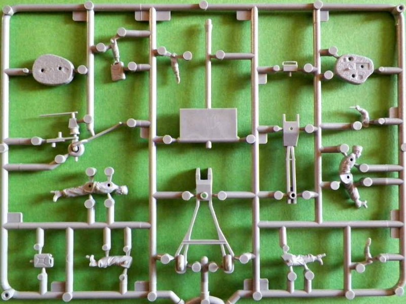 Zwei Dinge fallen beim Öffnen der kleinen Schüttbox sofort ins Auge: 1. Da es sich um einen Wargame-Bausatz handelt, ist eine Grundplatte für alle Figuren und das Zubehör vorgesehen. Für den Modellbauer gibt es aber alternativ auch kleine Grundplatten für die drei Einzelfiguren. 2. Anders als bei anderen Herstellern bestehen die einzelnen Figuren aus vielen einzelnen Teilen – Arme und jeweils ein Bein sind separat. Da sie sich aber nur in einer vorgegebenen Art und Weise anbauen lassen, erschließt sich mir der Sinn nicht wirklich.