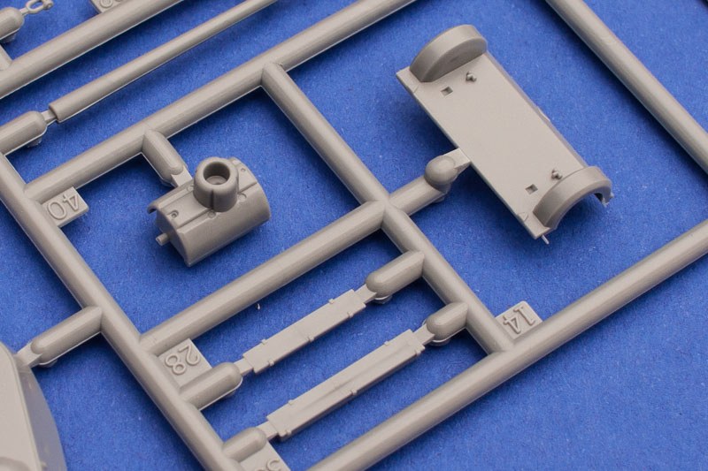 Revells diesjährige Neuheit ist wie erwartet eine unveränderte Wiederauflage des Bausatzes von 2002. Außer einer Wiederauflage im Jahre 2008 zusammen mit einem Set Figuren gabe es sonst keine weiteren Auflagen von Revell. Gegenüber der 2002er Version gibt es lediglich bei den Decals eine kleine Änderung, die '32' de 55. Garde-Panzerbrigade blieb erhalten, während die "242" der "212" gewichen ist, ein Fahrzeug einer nicht näher benannten Einheit. Die 135 in hellem Grau gespritzten Einzelteile sind von sehr guter Qualität und Detaillierung. Der Guss ist sehr sauber, Grat oder Fischhäute konnte ich keine finden. Der Zusammenbau sollte keine größeren Schwierigkeiten bereiten, die Konstruktion des Antriebes ist denkbar einfach. Alle Schwingarme sind bereits "in Position" und man braucht nur die Laufrollen anzukleben. Die Ketten sind in der bekannten Mischbauweise aus Segmenten und Einzelgliedern aufgebaut. Man kann zunächst das ganze Ensemble fertig montieren und bemalen, erst zum Schluss wird das Ganze als Baugruppe an die Wanne geklebt. Daher braucht man bei der farblichen Gestaltung derselben nicht auf die Ketten zu achten und kann sich so richtig austoben.