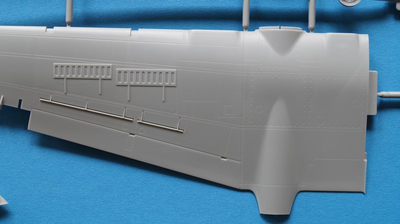 Das hier vorgestellte C-Modell ist eine Wiederauflage des erstmals 2015 von Hobby Boss erschienenen Modells mit der Nr. 81730. Die großen Teile wie Rumpf und Flügel sind gerade und ohne Verzug. Typisch für die heutige Zeit sind sie mit feinen versenkten Gravuren versehen und die Details der Hülle und Tragflächen liefern ein schönes detailliertes Abbild der Oberfläche. Der Cockpitbereich ist sehr gut und detailreich wiedergegeben, bietet aber noch Spielraum, um weitere Verbesserungen anzubringen (z.B. Gurtzeug etc.). Das Fahrwerk ist im sichtbaren Bereich sehr gut dargestellt, jeweils mit komplett durchdetaillierten Fahrwerksschächten. Ein Manko hierbei ist jedoch das Bugfahrwerksrad mit dem angegossenen, unpassenden Schmutzabweiser.
