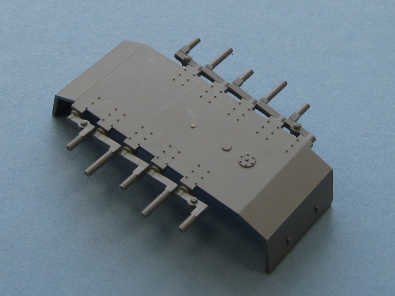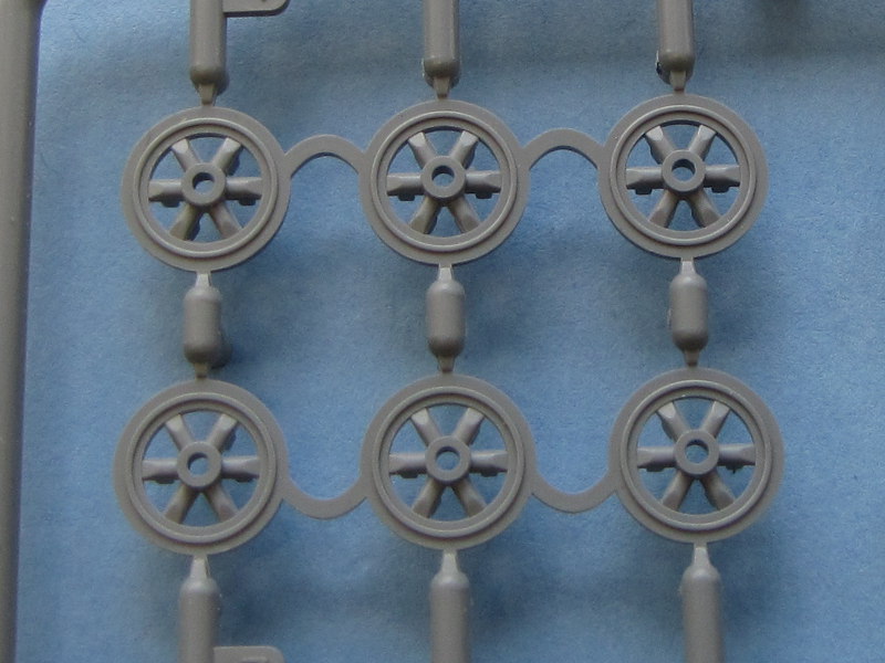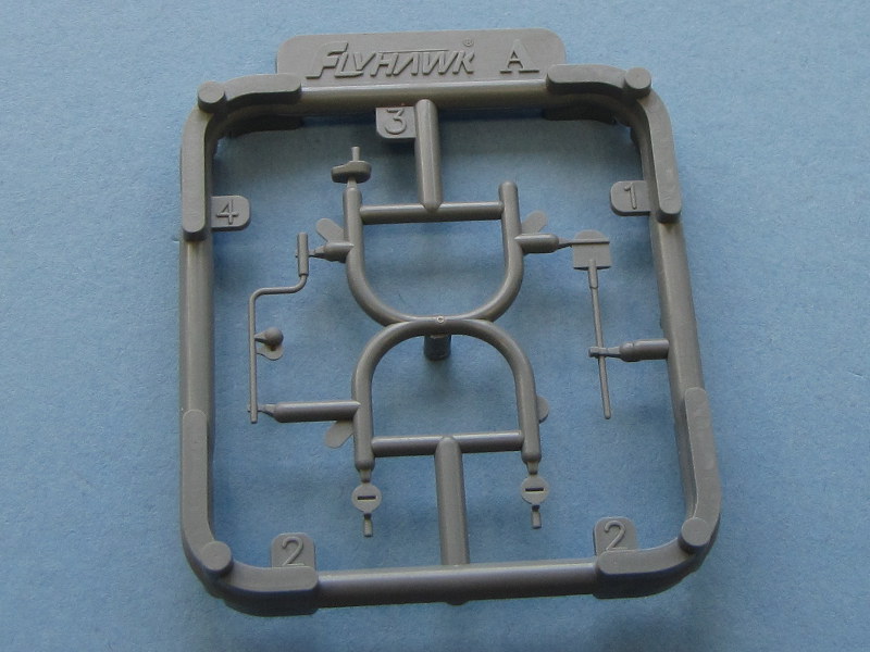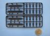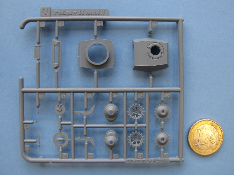 Die DetailsFlyHawk verwendet als Verpackung wieder den bekannten stabilen Karton und sichert die nicht weiter verpackten Spritzlinge mit maßgeschneiderten Schaumstoffumrandungen. Tiefer im Karton findet man eine separate Folienverpackung, die eine Ätzteilplatine, einen Markierungsbogen und einen Nylonfaden (als Abschleppseil) enthält. Eine Bauanleitung und ein Stück Karton, auf dem ein Stück Straßenpflaster gedruckt ist, runden den Kartoninhalt ab. Der Bausatz besteht aus elf Spritzlingen und zwei losen Bauteilen. Die vier kleinen, rechteckigen Spritzlinge können platzsparend ineinander gestapelt werden. Die Bauteile sind ohne erkennbare Grate oder Unsauberkeit hergestellt. Einige Bauteile sind von den vorherigen Versionen des Bausatzes übernommen (Spritzlinge A, C, E, F, V) und neue Spritzlinge oder lose Bauteile hinzugefügt (Spritzlinge S, T, U, O, Q, R). Die Details und Herstellungsqualität der Bauteile sind für den Maßstab 1:72 sehr detailreich und, nach meiner Meinung, derzeit die Messlatte für alle anderen Hersteller. Die Kettenstücke bestehen aus hartem Kunststoff, der am besten unter warmem Wasser vorsichtig in Form gebogen werden kann. Die Bausatzdetails