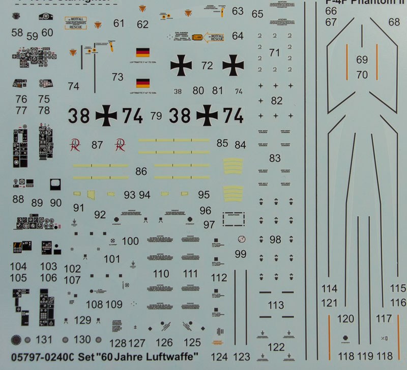 Der große Decalbogen wurde von Cartograf in Italien gedruckt und ermöglicht uns den Bau von jeweils einer Maschine jeden Typs. Die Qualität ist wie gewohnt sehr gut. Der Druck ist sauber und versatzfrei. Natürlich sind auch die Wartungshinweise und Cockpitdecals mit auf dem Bogen. Allerdings liegen für die nicht benötigten Waffen (Eurofighter) keine Decals bei, schade eigentlich. Für den Eurofighter hat man sich für die Jubiläumsmaschine zum 60-jährigen Bestehen entschieden. Es handelt sich um den Eurofighter mit der Kennung 30+68 vom TLG 74, wie sie im Juni 2016 beim Tag der Bundeswehr zu bestaunen war. Revell war seinerzeit selbst vor Ort, wie man dem Revell-Blog entnehmen konnte. Was die Bemalung angeht stellt uns Revell vor eine kleine Herausforderung, die Farbübergänge von Dunkelblau nach Hellblau müssen wir selbst vornehmen, Pinsellackierer werden hier wohl in die Röhre schauen. Der Tornado IDS mit der Kennung 43+50 ist beim TLG 33 in Büchel zu Hause und stellt eine recht aktuelle Maschine aus dem Jahre 2014 dar. 43+50 hatte ihren Erstflug am 18. März 1981 und wurde im Mai desselben Jahres ausgeliefert. Sie trägt den ganz normalen aktuell gültigen Tarnanstrich aus FS35237 über alles, so wie der Eurofighter. Diesen Farbton muss man sich aus drei einzelnen Farben zusammenmischen. Die F-4F ist ebenfalls eine Maschine aus den 2000ern, es handelt sich um die 38+74 des JG71 "Richthofen" vom August 2007. Die Maschine trägt das Norm 90J Schema aus FS 36375, FS 35237 und FS 36320. 38+74 ist eine Block 59 F-4F und wurde ca. 1976 als vorletzte F-4F an die Luftwaffe ausgeliefert. Die F-104G ist die einzige "historische" Maschine des Quartetts, die 24+88 stellt eine Maschine des JaboG31 "Boelcke" aus dem Jahre 1972 dar. Sie trägt den damals üblichen Norm 72 Anstrich aus RAL6014/7012 über RAL 9006. Die Maschine wurde am 11.09.64 von der Luftwaffe übernommen und trug bis 1968 die beiden Kennungen KG+338 und EB+234. Bevor sie zum JaboG31 kam, flog sie beim AG52. Im Mai 1983 wurde sie an die Türkei abgegeben.