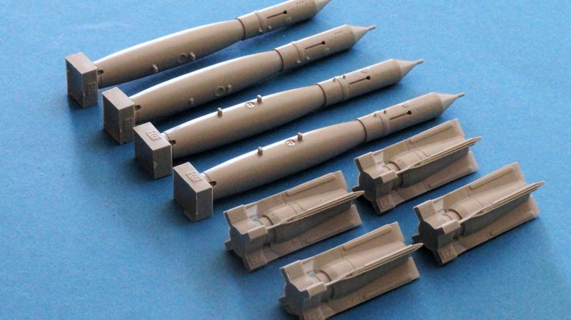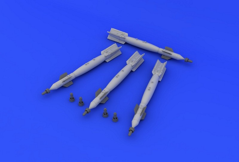 Zum Modell:Präzise wiedergegebene Resinteile bilden die Grundlage für dieses Upgradeset der Brassin Serie von Eduard. Hinzugefügt ist ein kleiner Decalbogen für Wartungs- und Warnhinweise an dem Bombenkörper. Die Bomben können mit zwei Arten von Suchköpfen ausgestattet werden. Das Abtrennen der Angussblöcke sollte relativ problemlos zu bewerkstelligen sein, und der Zusammenbau mit dem einteiligen Bombenkörper sollte auch keine Probleme darstellen. Darstellbare Maschinen: 2 unterschiedliche BombentypenStärken: