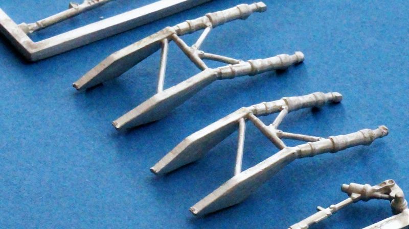 Besprechung:Dieses Upgradeset von Scale Aircraft Conversions für die Avro Shackleton von Airfix kommt in einer Blisterverpackung daher. Dabei sind acht Weißmetallteile, die die Teile für das Haupt- und Heckfahrwerk darstellen. Die Teile weisen keinen großen Unterschied zu den Bausatzteilen auf. Daher braucht man die Weißmetallteile nur ein wenig zu versäubern und damit die Bausatzteile ersetzen. Bis auf, dass man jetzt ein etwas robusteres Fahrwerk hat, besteht kein weiterer Unterschied oder Mehrgewinn an Detaillierung. Eine Einbauanleitung ist deswegen nicht vorhanden. Weitere Details wie Bremsleitungen oder ähnliches sind leider ebenfalls nicht vorhanden.