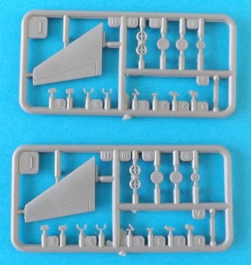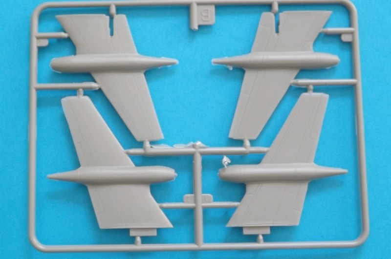 Die Spritzlinge sind gut sortiert und sehr schön gearbeitet. Selbst so filigrane Teile wie das Fahrgestell sind gut detailliert. Die Flügel und die Zusatztanks in den Flügeln sind mit einigen Graten und Fischhäuten versehen. Sonst sind alle Teile gut ausgegossen, auch die kleinen Teile wie Rumpfantennen, Fahrgestellklappen und Räder. Gut gefallen auch die Gravuren in Rumpf, Leitwerk und Flügeln. Auch die Klarsichtteile sind gut gelungen.
