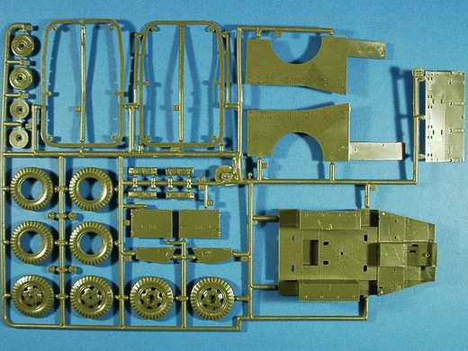 Besprechung:Immer noch relativ sauber gespritzer Bausatz der aber etwas Nacharbeit durch Auswerferstellen im Sichtbereich und Grat an der Formennaht erfordert. In der Wiederauflage dieses nun doch schon etwas betagten Fahrzeuges hat sich gegenüber früheren Auflagen nur die Verpackung und der Decalbogen geändert. Erstere ist etwas stabiler und der Decalbogen etwas umfangreicher geworden. So lassen sich 2 amerikanische und 1 russisches Fahrzeug markieren. Die Bauanleitung umfasst 15 Abschnitte auf einem A3 Faltblatt. Sie ist übersichtlich und sollte alle Fragen zum Zusammenbau beantworten. Im abschließenden 15. Bauabschnitt hat man die Möglichkeit das Fahrzeug wahlweise mit geöffneten oder geschlossenen Kühlerklappen zu bauen.