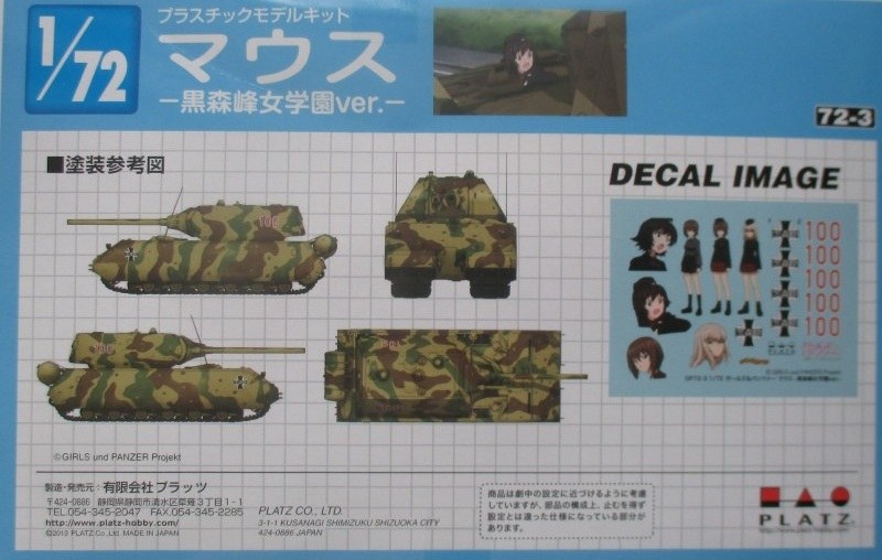 Mein Problem: Ich suche eine Maus in 1:72. Aber es sollte auf keinen Fall ein Fertigmodell sein - welch Blasphemie - und bitte auch nicht den Erprobungsturm aufweisen. Also ein Modell mit Kanone. Da bin ich in den Weiten des Internets in Japan fündig geworden und musste nicht einmal Zoll bezahlen. Dragon hat ein 1:72 Modell. Hier war ich erstaunt: die Firma Platz hat die Dragonteile genommen, neu verpackt, mit zu einer Trickfilmserie passenden Decals versehen und eine neue Bauanleitung beigelegt. Es gibt in Japan eine Trickfilmserie "Girls and Tanks". Darauf bezieht sich dieser Bausatz.