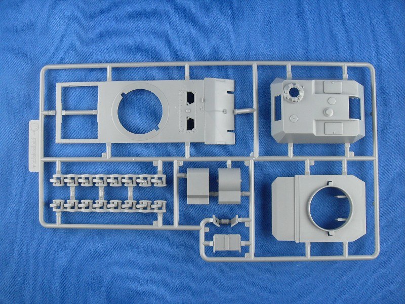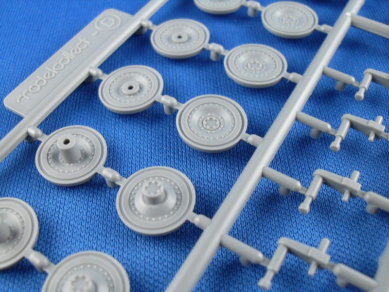 Beim E-100 Flakpanzer with Flak 88 handelt es sich um eine Formvariante des bereits hier vorgestellten E-100 Heavy Tanks Ausf. B. Wie auch im Originalkonzept unterscheidet sich diese Version von der schweren Ausführung dadurch, dass diese einen drehbaren Turm mit zwei 8,8 cm Flugabwehrkanonen aufweist. Der Bausatz besteht aus insgesamt sechs Spritzlingen, Gummiketten und Metallteilen. Einer der Spritzlinge (B) wurde geteilt, da dieser ansonsten nicht in die Verpackung passt. Auch diesem Bausatz liegt die Motorinnenraumausstattung bei, sodass der Motorenraum geöffnet dargestellt werden kann. Im Gegensatz zum „Heavy Tank“-Bausatz liegen dieser Version keine Metallspiralfedern bei. Abgerundet wird der Bausatz durch zwei Fotoätzplatinen sowie die zwei Metallrohre. Wie bei Modelcollect üblich, sind alle Teile sauber verarbeitet und fein detailliert. Aufgrund der überschaubaren Anzahl der Teile sowie der übersichtlichen Montageanleitung lässt sich der Bau rasch realisieren. Der Decalbogen ist überschaubar und dient auch anderen Fahrzeugen der E-Serie. Er ist sauber gedruckt.