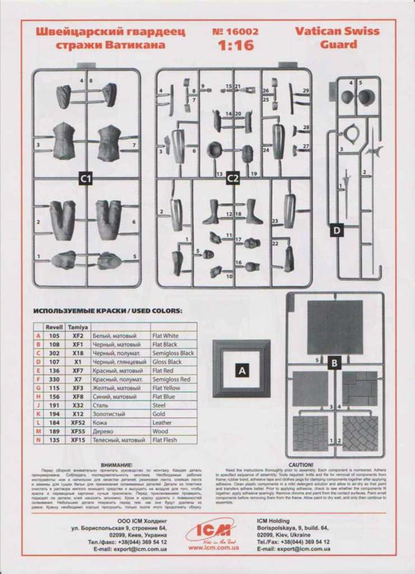 Die zweiseitige farbige Bauanleitung ist eigentlich gar keine, weil kaum der Zusammenbau erklärt wird, eher geht es um die Bemalung. Decals gibt es keine. Für die Bemalung sind Farben aus den Sortimenten von Revell und Tamiya angegeben. Insgesamt müssen 13 verschiedene Farben auf die Figur gebracht werden. Außerdem liegt dem Bausatz noch ein Foto eines Gardisten der Schweizer Garde bei, leider nur von der Vorderansicht. Die Rückseite des Soldaten wäre für die Bemalung auch hilfreich gewesen.