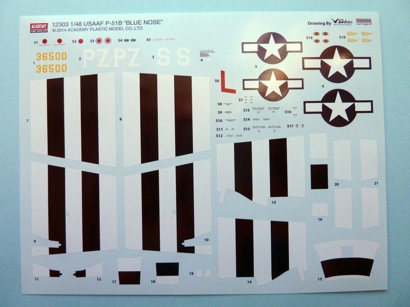 Decals und MarkierungenMit dem vorliegenden Decalbogen kann leider nur ein "D-Day"-Mustang gestaltet werden. Es handelt sich um eine P-51B, Ser.Nr. 43 6500 „PZ-S“, 486th Fighter Squadron, 352nd Fightergroup, 8th USAAF, Bodney/Norfolk, Juni 1944. Sie hatte eine Tarnung von Olive Drab über alles mit blauer Cowling-Oberseite und wies prominente D-Day-Markierungsstreifen auf, die als Decals beiliegen. Der Decalbogen wurde 2011 von Gravity Wings gestaltet und von Cartograf in Italien gedruckt. Die Farben kommen satt herüber. Alle Beschriftungen sind zudem versatzfrei gedruckt. Der Decalbogen hinterlässt insgesamt einen guten Eindruck.