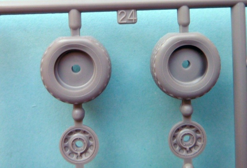 Die Oberflächen weisen feine Details und feine Gravuren auf. Sehr schön ist die Nietstruktur der Flügel und des Rumpfes wiedergegeben, wo wie beim Original Senkniete und erhabene Rundkopfniete vertreten sind. Der Bausatz enthält zwei Paar Räder, davon ein Paar mit realistisch abgeflachter und eines mit "runder" Lauffläche, dazu zwei verschiedene Sorten Mustang-Felgen. Sehr gut - das kriegen in dieser Vielfalt einige "moderne" Hersteller so nicht hin. Außerdem sind zwei Cockpit-Seitenkonsolen beigefügt, verwendet werden davon die Teile 78 und 79 (die Bauanleitung nennt fälschlicher Weise Teil 79 zweimal). Übrig für die Grabbelkiste bleiben Teile 16 und 17, mit denen das Cockpit eines frühen A-Mustangs dargestellt werden könnte. Die Steuerflächen finden wir in neutraler Position vor, was schade ist, weil die Landeklappen bei abgestellten Mustangs meist abgesenkt waren. Hier wird Sägearbeit unerlässlich sein, um herabgelassene Flaps darzustellen. Wie beim Tamiya- und ICM-Kit hat leider auch dieser Bausatz in die Flügel integrierte Radschächte, die beim Original allerdings tiefer gelegt und anders ausgeformt waren. Im Gegensatz zu Tamiya ist der Cockpitboden im vorliegenden Bausatz erfreulicher Weise korrekt wiedergegeben und weist eine etwas prominente aber stimmige Holzstruktur auf. Die Bausatzteile und der Decalbogen