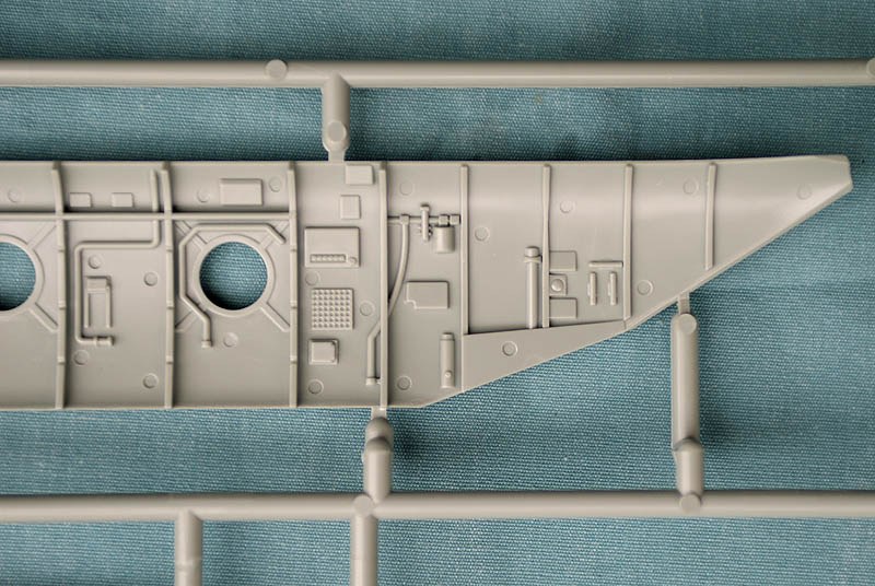 Die komplette Inneneinrichtung wird als zweite Schale in die Rumpfhälften eingebaut, auch hier entspricht die Teilequalität dem bereits beschriebenen Standard. Ins Auge fallen die mit Spanten, Streben, Installationen und Leitungssträngen detailreich und scharf wiedergegebenen Seitenwände, auf denen es aber eine Vielzahl an Auswerfermarken zu versäubern gilt. Allerdings stellt sich die Frage, wie viel davon am Ende noch zu sehen ist. Der Laderaumboden ist mit Rollbahnen und Zurrösen versehen, ein Deckenteil verhindert den Einblick in die offenen Getriebegehäuse. Korrekt und plastisch dargestellt ist der Geräteträger samt Doppelschott zwischen Laderaum und Cockpit. Die Einrichtung des Laderaumes kann mit Sitzbänken oder Tragen gestaltet werden.