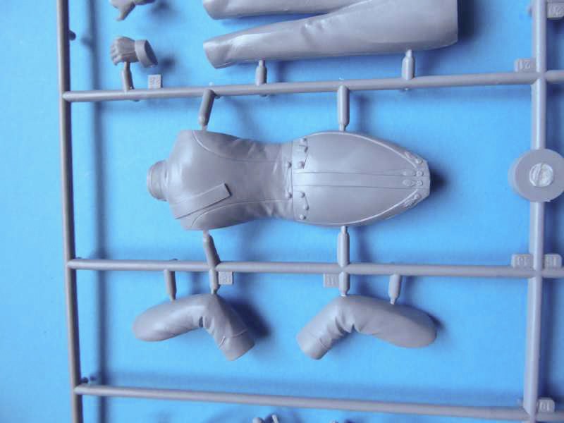 Zwei Spritzlinge sind für den italienischen Carabinieri, wobei die Uniform sehr gut wiedergegeben wurde. Der Faltenwurf ist exzellent und alles ist sehr gut detailliert. Als Kopfbedeckung dient ein Zweispitz mit Federschmuck, der mit Kinnriemen getragen wird. Wie die Passgenauigkeit der Teile ist, kann man erst nach dem Zusammenbau beurteilen. Die übliche zweiseitige farbige Bauanleitung, die gleichzeitig Bemalungsanleitung ist, liegt dem Bausatz bei. Decals gibt es keine. Auch wird wieder überhaupt nicht auf den Hintergrund der dargestellten Figur eingegangen.