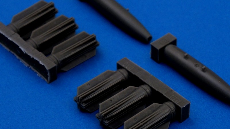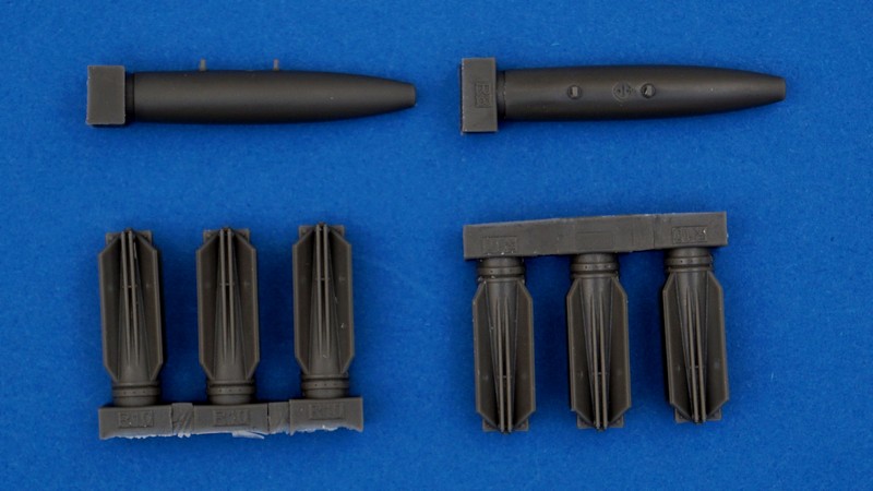 Endlich ein Rüstsatz im Maßstab 1:32 für größere Maschinen mit einem guten Preis-Leistungs-Verhältnis. Es können damit sechs Sprengkörper gebaut werden, was in der Regel für eine Waffenzuladung ausreicht. Der große Vorteil gegenüber bausatzüblichen Spritzgussbomben liegt eindeutig darin, dass die Brassin-Bombenkörper aus einem Stück gegossen sind und somit das Zusammenkleben der Hälften entfällt, was bausatzabhängig wieder Schleifarbeiten nach sich ziehen würde.