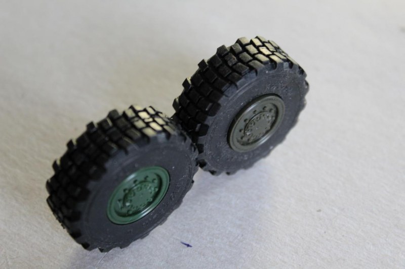 Etwas unlogisch ist der Bau des Fahrwerkes. Die Achsschenkel sollen nicht geklebt werden, aber das Lenkgestänge darf geklebt werden. Wären die Zapfen an den Lenkstangen etwas länger, könnte man sie mit einer heißen Klinge abplatten und so beweglich lassen. Es wird auch nicht darauf hingewiesen, das die Achsen einen unterschiedlichen Lenkeinschlag haben. Ich habe schon einige Füchse gebaut und mich seit Anfang mit den Problemen befasst. Dazu gehören auch die Räder. Die Reifen sind gut wiedergegeben mit Beschriftung und schönem Profil, wenn man die Angüsse und die Naht abschleift. Ich habe nie Probleme mit Vinylreifen gehabt, andere Modellbauer stehen diesem Material skeptisch gegenüber. Ich habe eher ein Problem mit den überstehenden Felgen. Man erkennt es gut auf dem Titelbild des Bauplans. Da ist Schleifarbeit sinnvoll, wie ich es bei einem Bild andeutete.