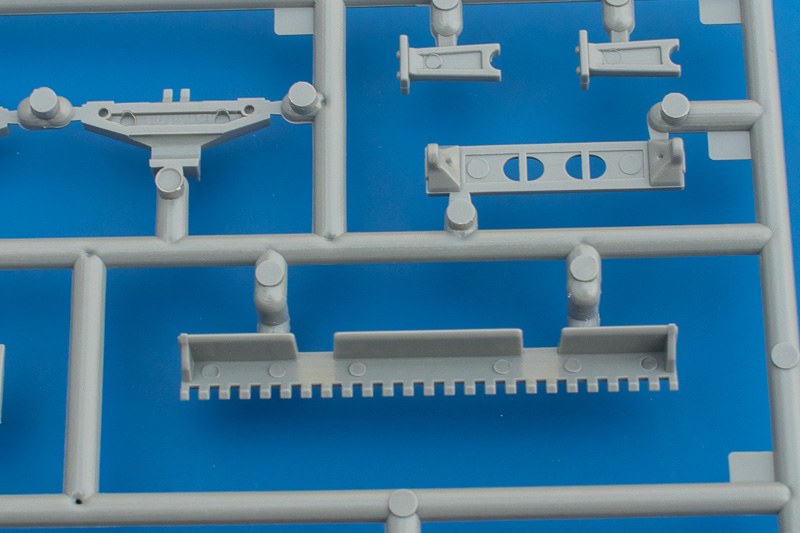 Das Groß der Einzelteile entfällt auf das Kettenlaufwerk. Dieses ist so aufgebaut, dass man es ohne Weiteres als separate Baugruppe fertigstellen kann und erst ganz zum Schluss am Modell anbringt. Die Schwingarme sind jeweils an einer gemeinsamen Grundplatte angegossen, auf der alles aufgebaut wird. Als Anbauteile bleiben hier nur die Laufrollen, Zahnkränze und natürlich die Kette übrig. Leztere ist aus Segmenten aufgebaut und sehr schön gemacht. Störende Auswerfermarken an den Kettengliedern konnte ich keine ausmachen, es gibt lediglich ein paar Sinkstellen an den Gummipolstern. Es sollte aber kein allzu großes Problem darstellen, sie zu beseitigen. Die Gummiauflagen der Laufrollen mit ihren Querfugen wurden sehr überzeugend wiedergegeben, das Problem hierbei ist, dass ich diese Rillen auf keinem Bild zum Original habe finden können. Die Laufflächen sollten abgesehen von Ausbrüchen durch Abnutzung eigentlich glatt sein, wie beim Biber. Wer das ändern will ist bei 32 Rollen eine Weile beschäftigt. Damit wäre schon alles gesagt zum Leopard 1. Machen wir daher gleich beim Biber weiter.