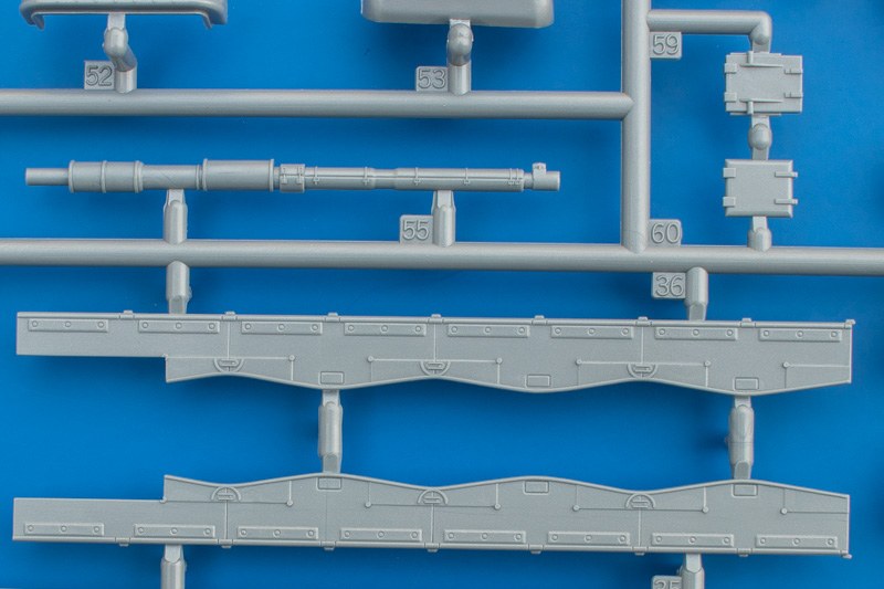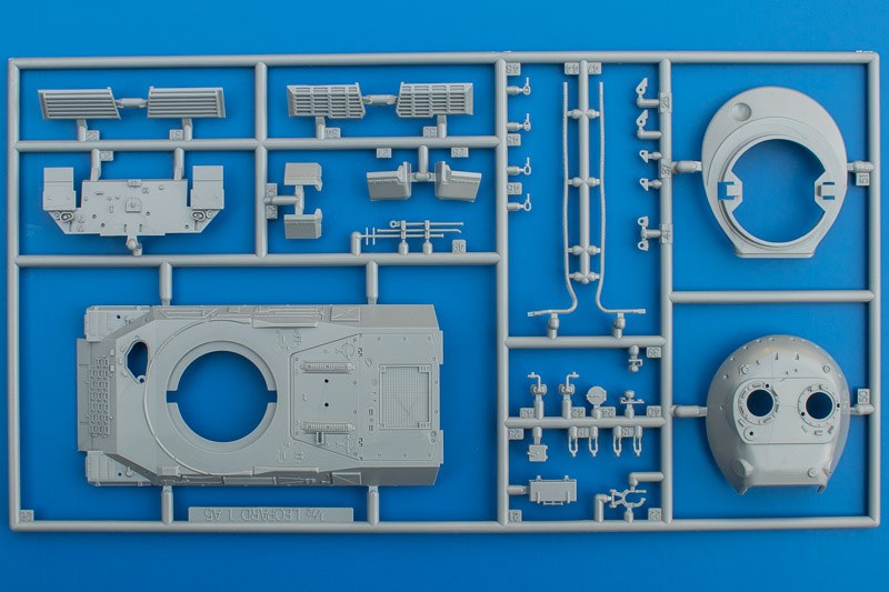 Leopard 1A5Der Bausatz des Leopard 1A5 besteht aus ca. 155 Einzelteilen. Die Detaillierung ist insgesamt sehr gut. Der Aufbau des Modells fogt der üblichen Art und Weise, wie man das von Revell gewohnt ist. Die Oberwanne besteht aus einem Bauteil und ist mit zahlreichen versenkten und erhabenen Details versehen. Letztere sind für meinen Geschmack teilweise ein wenig zu reliefartig ausgefallen, besonders bei den angegossenen Werkzeugen an den Seiten oder den "Eiskratzern" für die Ketten am Bug. Wer entsprechende Teile in seiner Grabbelkiste hat, sollte zumindest die Werkzeuge austauschen. Die seitlichen Gitter am Heck sind in zwei Ausführungen enthalten, die Teile mit den senkrechten Streben sind für frühe Baulose zu verwenden. Zahlreiche Anbauteile wie Seile, Haken, Ösen, Spiegel usw. vervollständigen diesen Teil des Modells. Der Turm wird später nur aufgesteckt. Die Zusatzpanzerung ist mit einem komplexen Muster versehen, welches man vielleicht etwas in seiner Ausprägung abmildern sollte, für 1:72 ist es vielleicht doch etwas zu prominent (aber schön gemacht!). Die Kanone bzw. das Rohr ist aus einem Stück und muss vorne nur aufgebohrt werden. In der Neigung ist sie fix, was wegen der Manschette aber in Ordnung ist, man hätte die Bewegung sowieso nicht überzeugend nachbilden können. Die Luken sind separate Teile, hier fehlen nur ein paar Figuren, die man darin unterbringen kann
