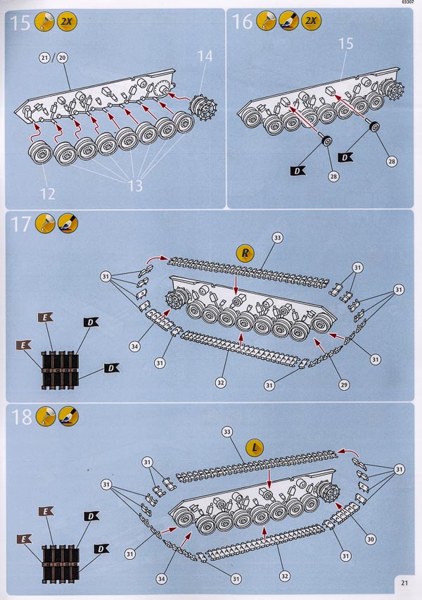 BiberObwohl das Original auf dem Fahrgestell des Leopard 1 aufbaut findet man kaum gemeinsame Bauteile aus dem Leopard 1 Bausatz. Zwar wirken viele Teile auf den ersten Blick gleich, bei genauerem Hinsehen kann man erkennen, dass die Teile nicht nur neu angeordnet und ergänzt wurden, sondern auch vieles im Detail angepasst wurde. Was die Unterwanne mit dem Kettenlaufwerk angeht ist es wie beim Leopard 1A5, die Schwingarme sind bereits an den separaten Seitenteilen angebracht und man muss nur die Rollen und die Kettensegmente anbringen. Wie oben bereits erwähnt sind die Gummiauflagen auf den Laufrollen glatt, so wie es sein soll. Der Stützschild kann sowohl abgesenkt wie auch hochgeklappt angebaut werden. Ich denke mit etwas Geschick kann man den auch beweglich gestalten. So ganz genau darf man dann aber die Lage des Panzers nicht nehmen, denn durch das Absenken des Erdsporns federt das Laufwerk vorne aus wie man sehr schön in den diversen Videos auf Youtube sehen kann. Revell empfiehlt ein kleines Gewicht einzubauen, je nachdem wie man die Brücke später anbaut kann das sicherlich auch schwerer ausfallen als die angegebenen 25g.