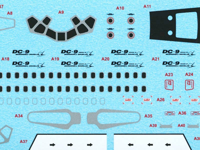 Als dritten Bogen gibt es, wieder als Siebdruck, die Stencils inklusive Fenster, die Ausführung ist neutral und sollte für alle DC-9 und MD-80 brauchbar sein. Für die Kabinenfenster gibt es leider nur gezählte 15 Stück mit Silberrahmen und transparenter Scheibe, die für die Nachbildung von „Blindfenstern“ gedacht sind. Für Austrian Airlines sind außerdem die Notausstieg-Gehflächen auf den Tragflächen in der falschen Farbe, diese wurden daher als Laserdruck-Decal extra beigelegt.
