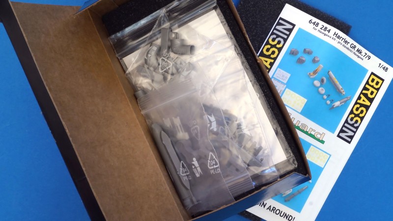 Zum Set von Eduard:Eduard hat zu der Harrier Gr Mk.7/9 von Hasegawa in 1:48 ein Upgrade-Set herausgebracht, welches zu der hauseigenen Brassinserie gehört. In diesem Set wurden drei von Eduard verfügbare Sets zusammengefasst und es setzt sich wie folgt zusammen. Eduard 648267 Harrier GR Mk.7/9 exhaust nozzles 1:48 Eduard 648273 Sniper ATP for Harrier GR.9 1:48 Eduard 648266 TERMA pod 1:48 Der Hersteller hat diese Zurüstteile nun auch auf diesen bestimmten Flugzeugtyp von Hasegawa abgestimmt, der ja auch von Eduard vertrieben wird. Mit diesem Set lässt sich die Triebwerkssektion der Harrier Gr Mk.7/9 sehr gut aufwerten. Weiterhin wurden noch Räder aus der Brassin Serie beigelegt, die jedoch nicht abgeflacht dargestellt sind. Man kann sie zum Lackieren mit Maskierfilm versehen. Beigelegt ist auch ein gut detaillierter Schleudersitz, der mit dem passenden Gurtzeug aus Photoätzteilen versehen werden kann. Zu guter Letzt wird alles mit einem ausführlichen Decalset ergänzt. Der große Vorteil bei den Teilen ist, dass diese schon hochdetailliert in einem Stück gegossen sind, so dass ein Zusammenkleben entfällt. Das ganze Paket ist zur Freude des Modellbauers günstiger als würde er die drei Sets einzeln kaufen.